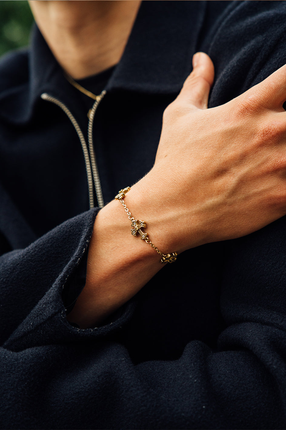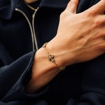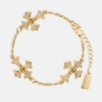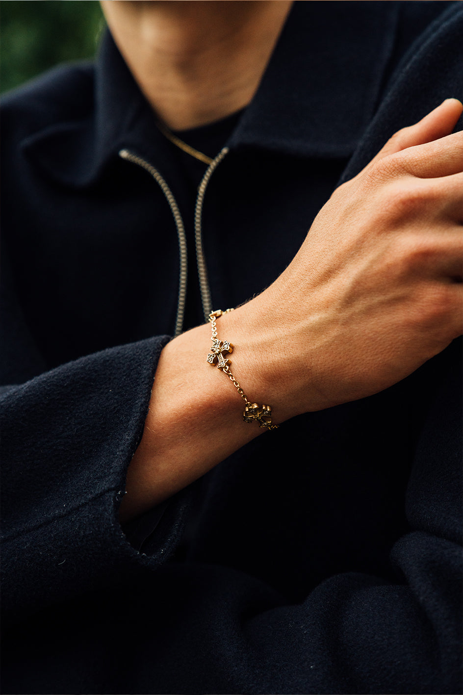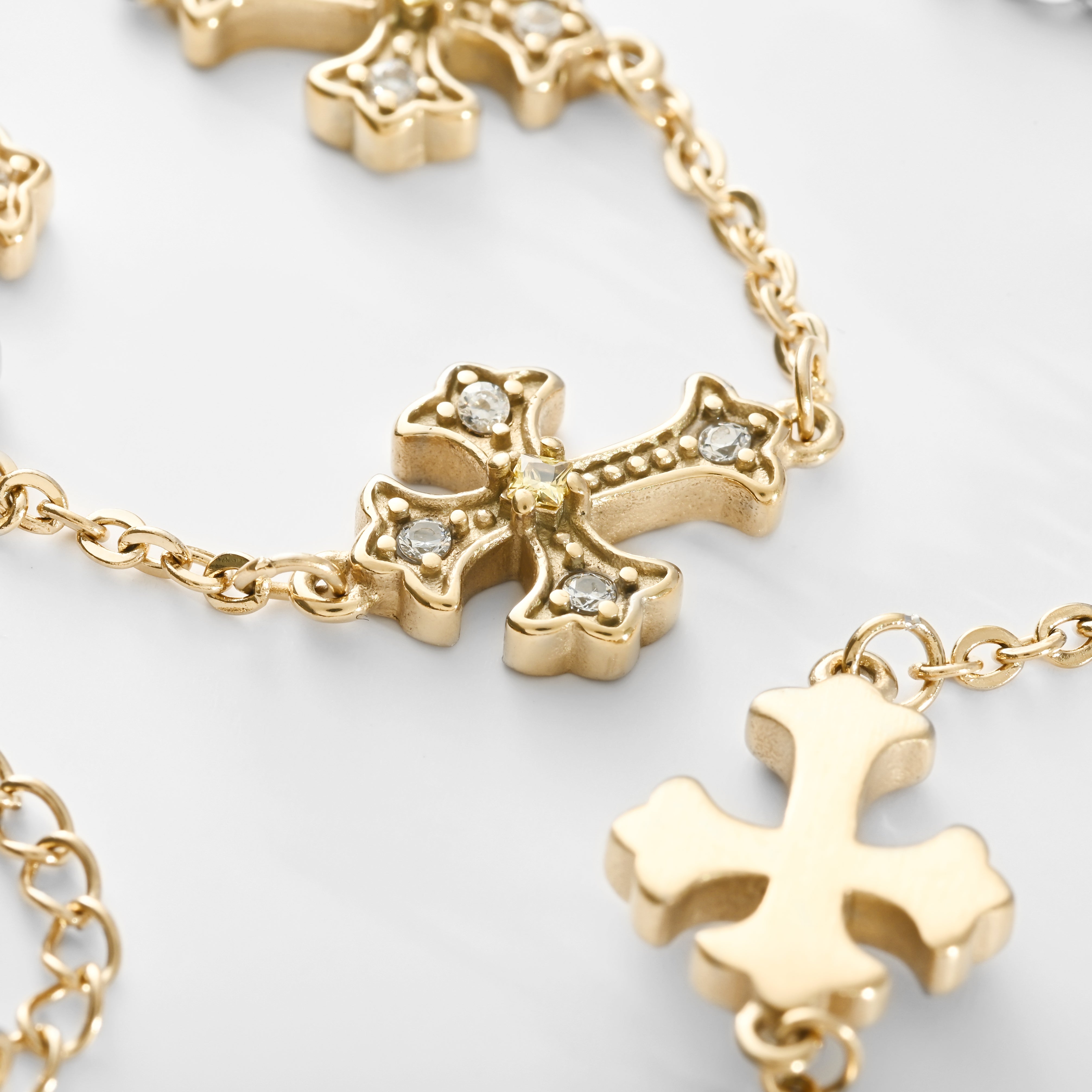 Handcrafted in 14k Gold, our Vintage Crucifix bracelet with triple cross design from the 1980s. Embedded with citrine & white zirconia gemstones, held on a figaro chain.