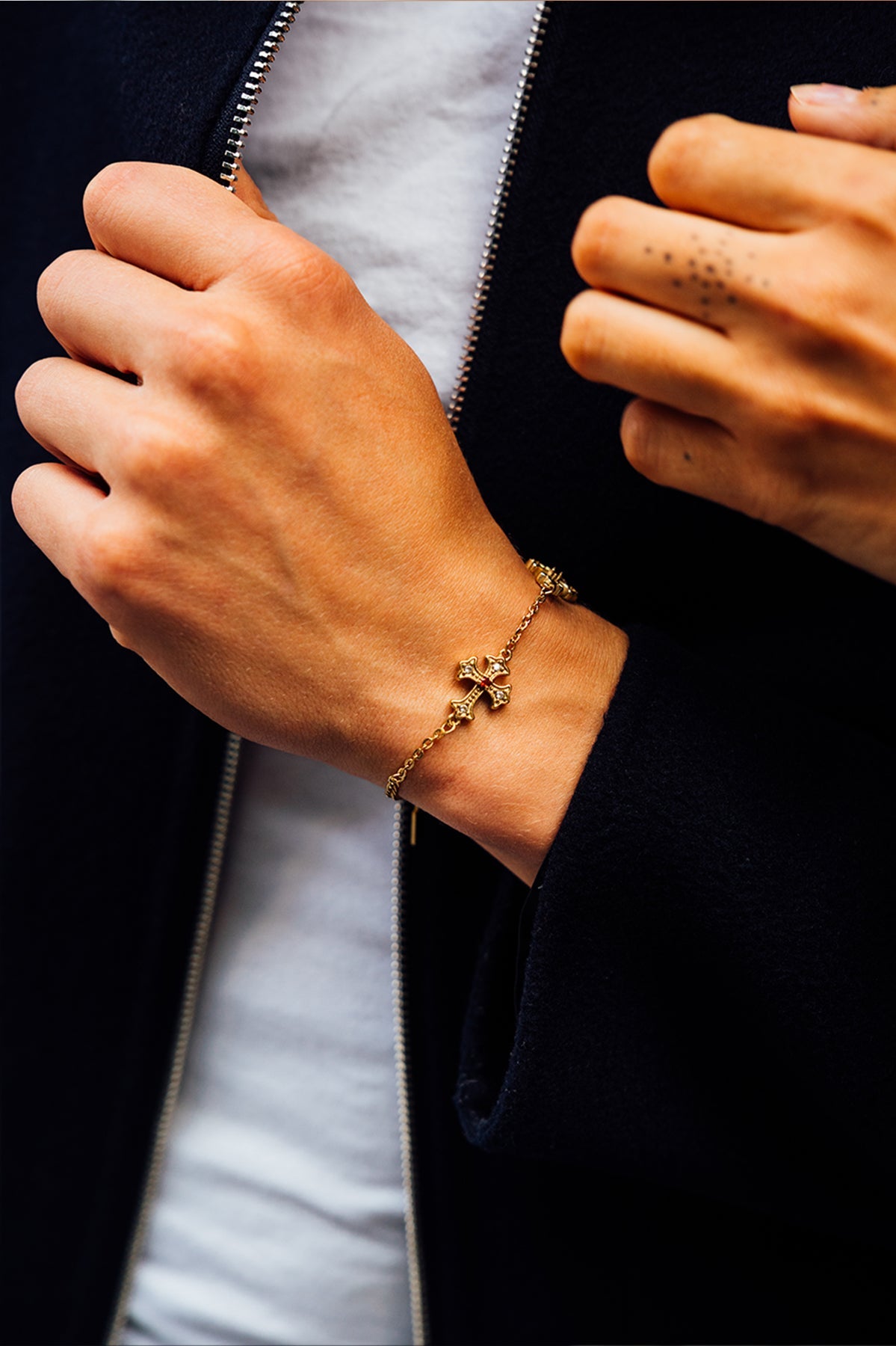 Handcrafted in 14k Gold, our Vintage Crucifix bracelet with triple cross design from the 1980s. Embedded with emerald & white zirconia gemstones, held on a figaro chain.