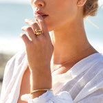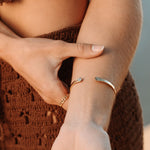 Our Gold Hammered Cuff captures the essence of the ocean. Its textured surface catches the light like sunlight on water, perfect for adding a splash of elegance to any outfit. This cuff is your seaside escape, wrapped around your wrist!