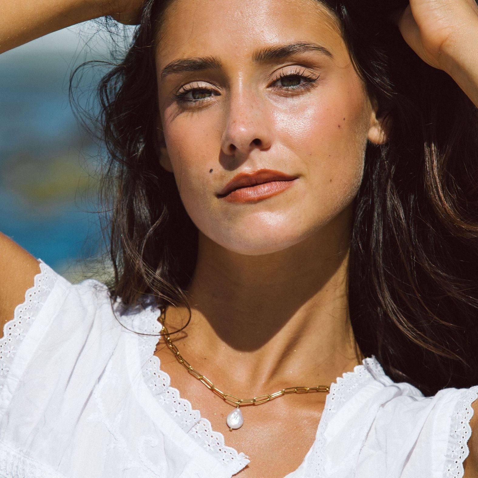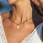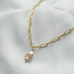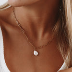 Holds the Ocean close to your heart with this statement Keshi Pearl Necklace. A precious piece of jewelry made from a 18k gold plated paperclip chain with a natural Keshi pearl, the rarest type of baroque pearls.