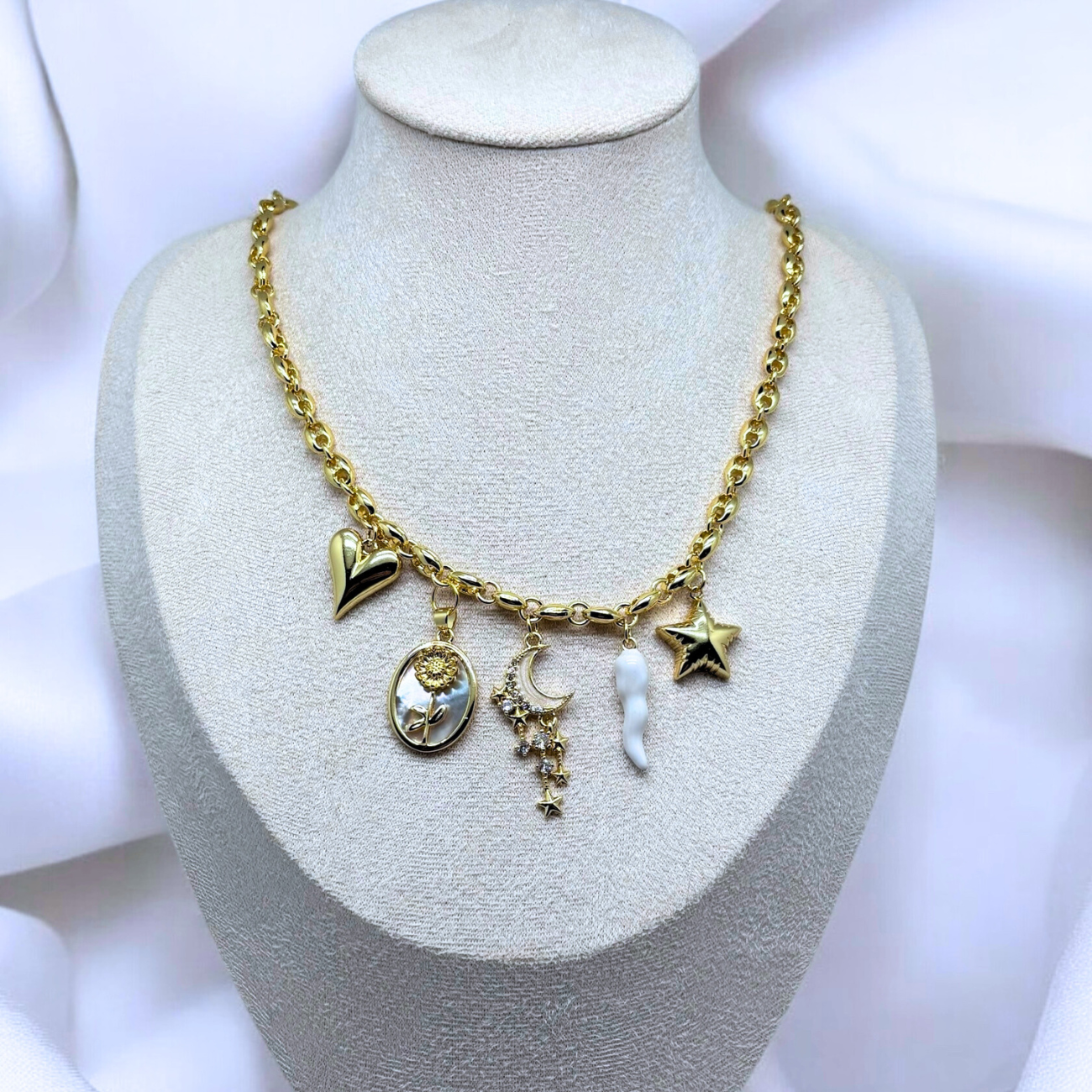 A radiant gold-tone necklace adorned with meaningful charms: a heart, a floral pendant, a sparkling crescent moon, a tooth charm, and a star. Perfect for adding a dreamy, symbolic touch to any outfit.