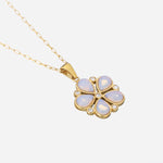 The Elva necklace blooms with soft iridescence and delicate crystals, forming a golden flower that captures the spirit of new beginnings and eternal beauty.