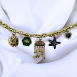 A charming gold-plated chain necklace featuring unique, nature-inspired charms, including a bee, medallion, starfish, gemstone, and dangling details, perfect for a playful yet elegant look.