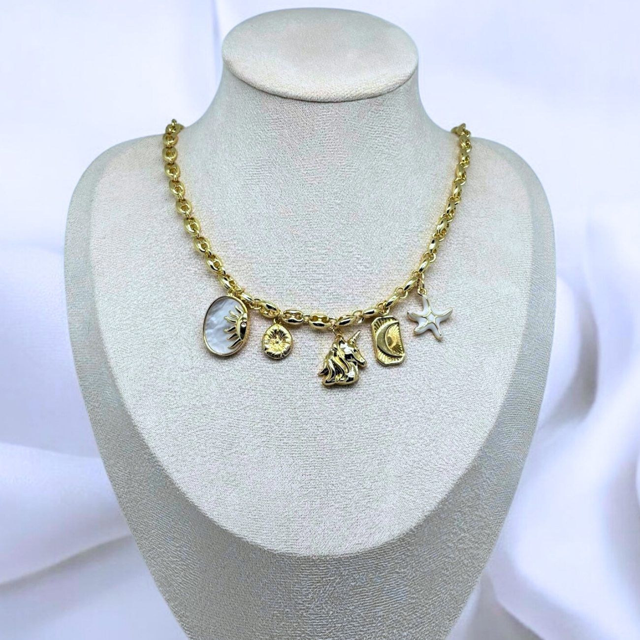 A mystical gold-plated chain necklace featuring celestial charms, including a unicorn, sunburst, crescent moon, starfish, and a radiant mother-of-pearl sun design, perfect for those who embrace magic and wonder.