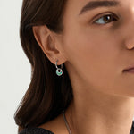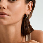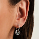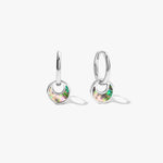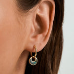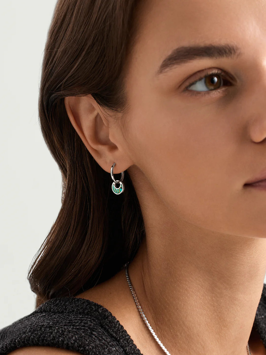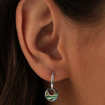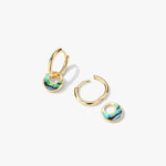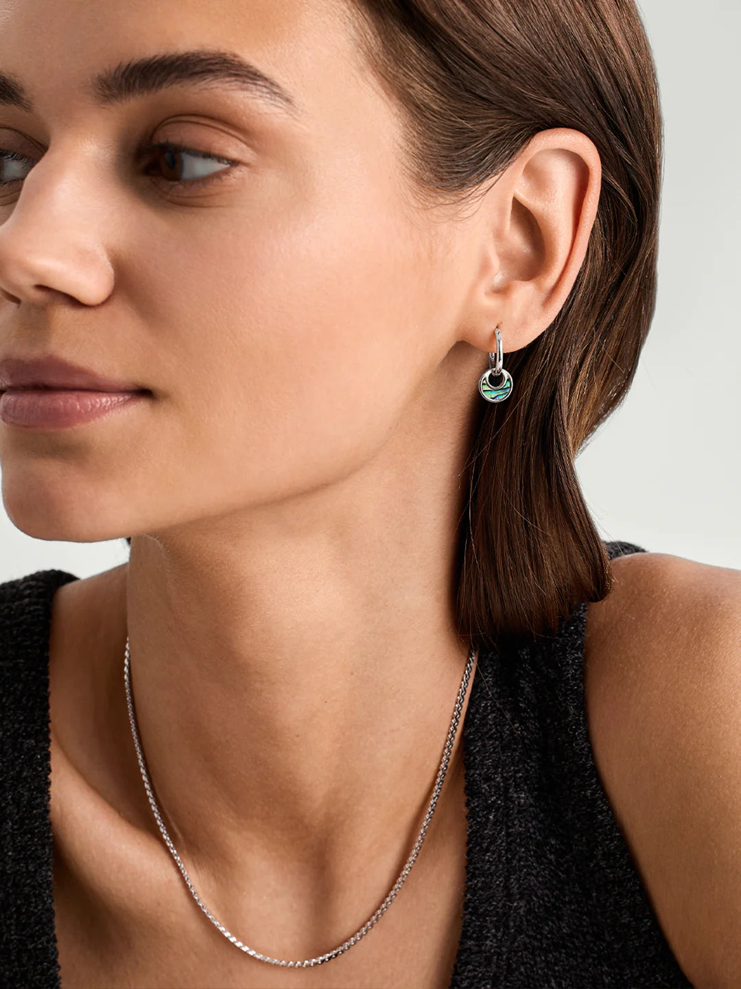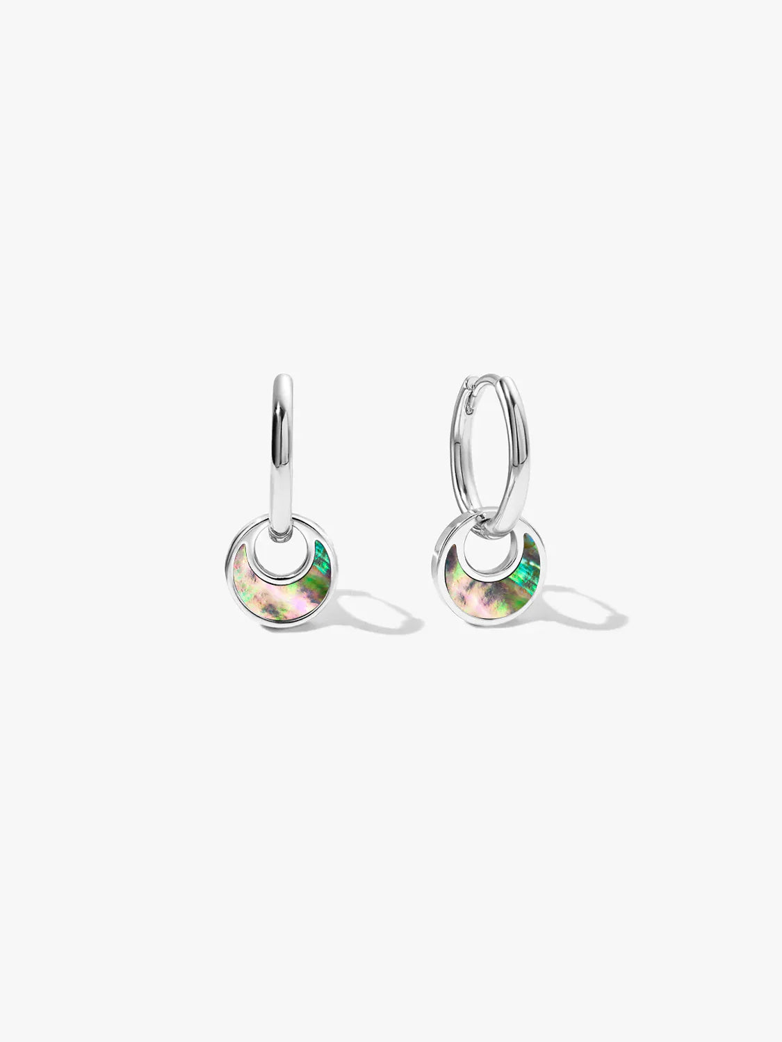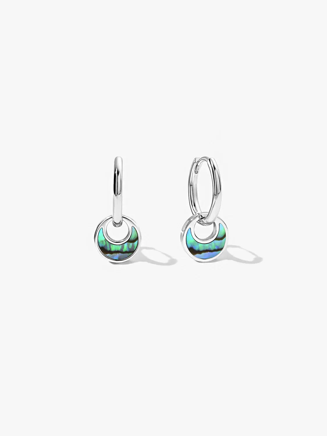 These earrings feature suspended huggie hoops with round disc designs, adorned with crescent moon-shaped inlays made from natural abalone shell. Known for its iridescent beauty, each shell reveals a unique mix of colors—ranging from deep blues and greens to soft pinks and pearlescent whites—making every piece truly one of a kind. A sophisticated accessory that captures both elegance and individuality.
