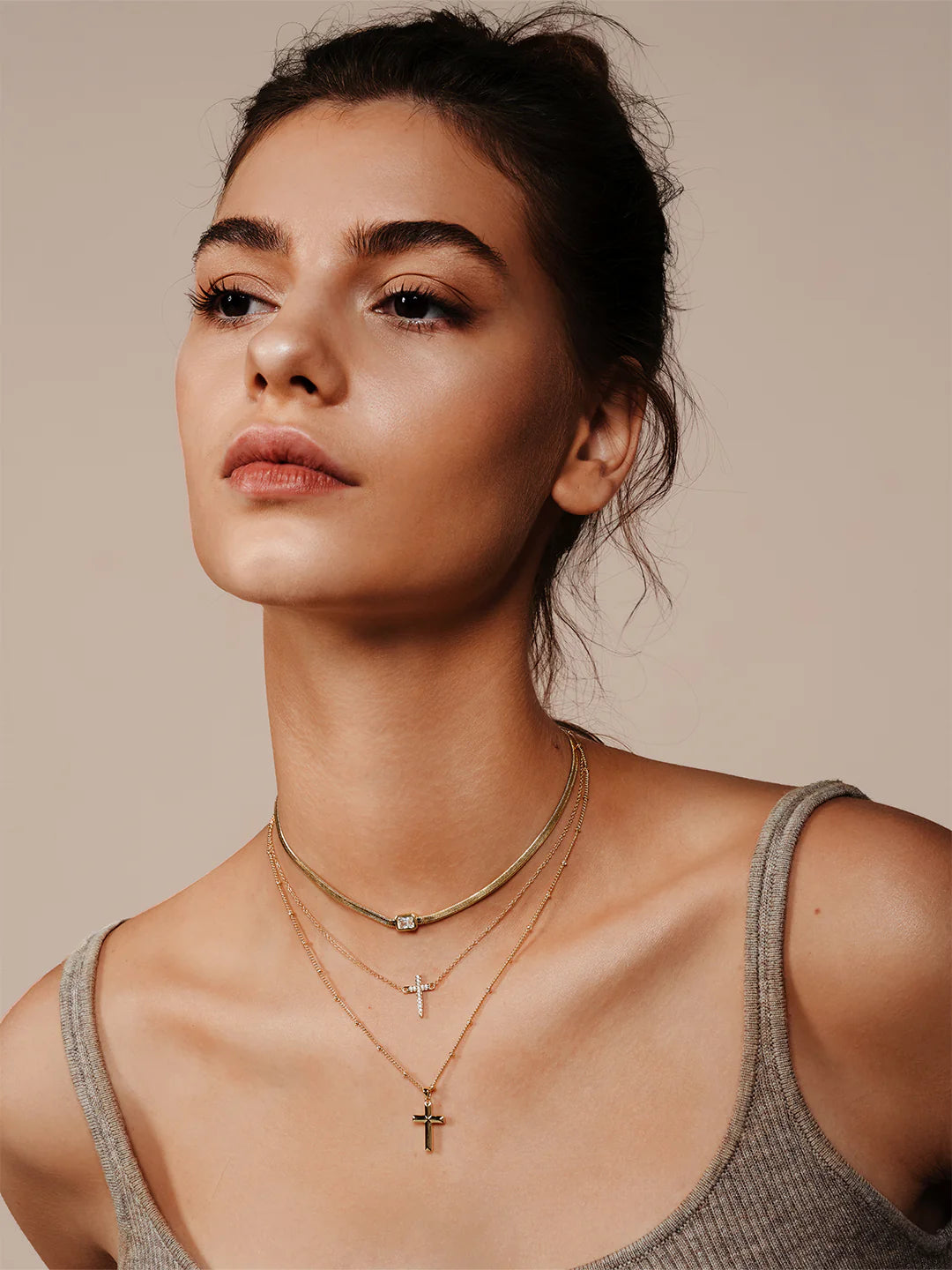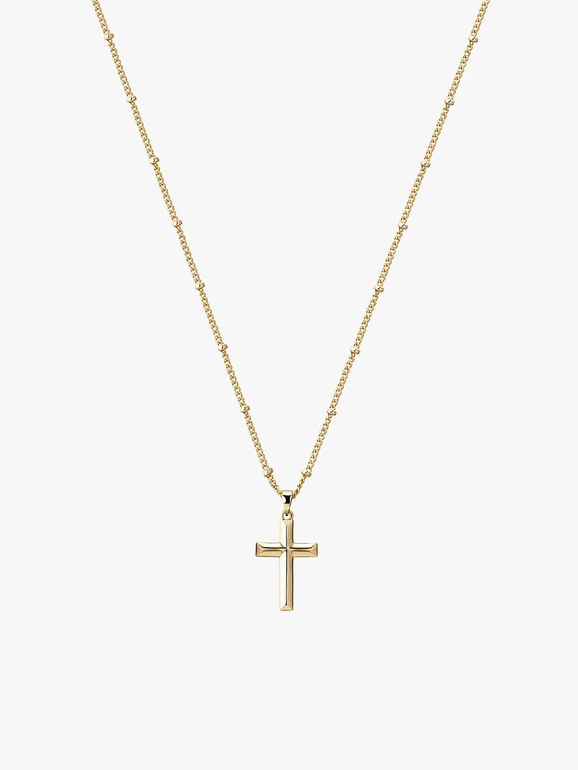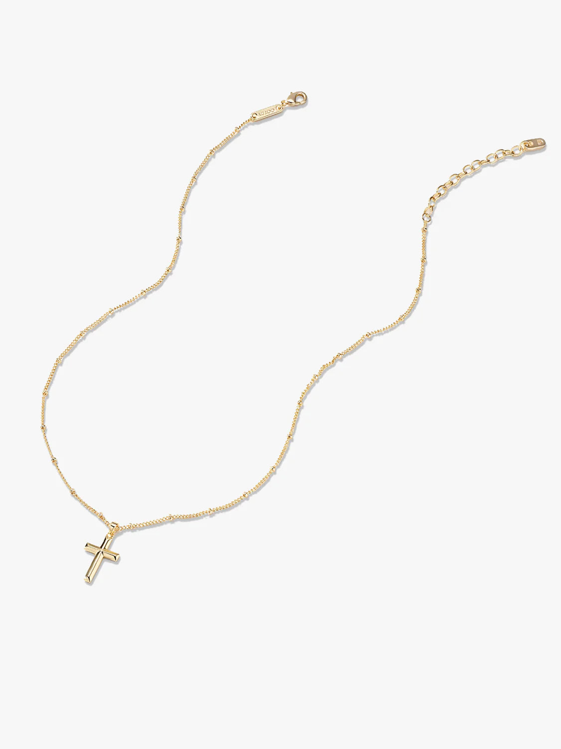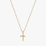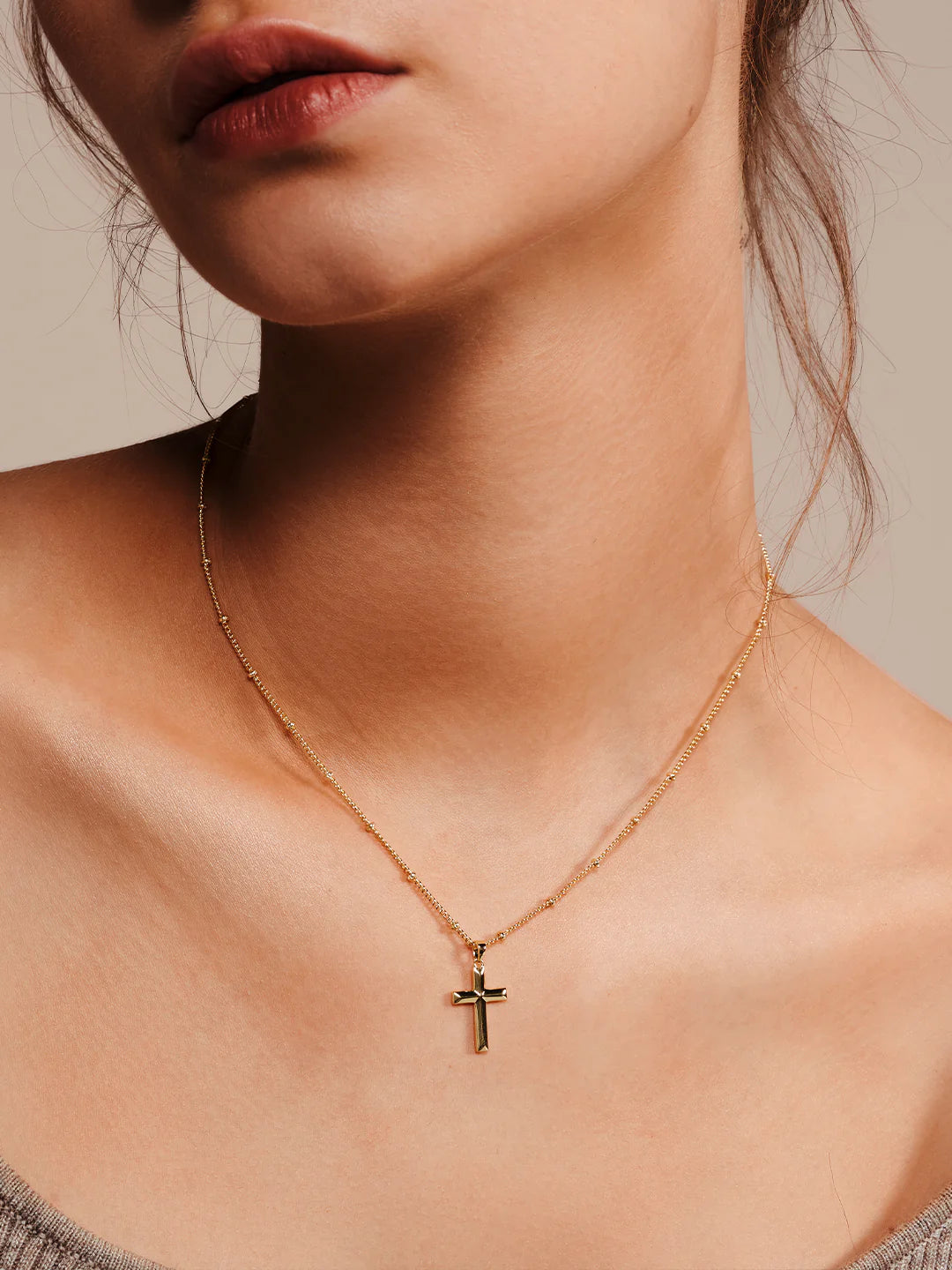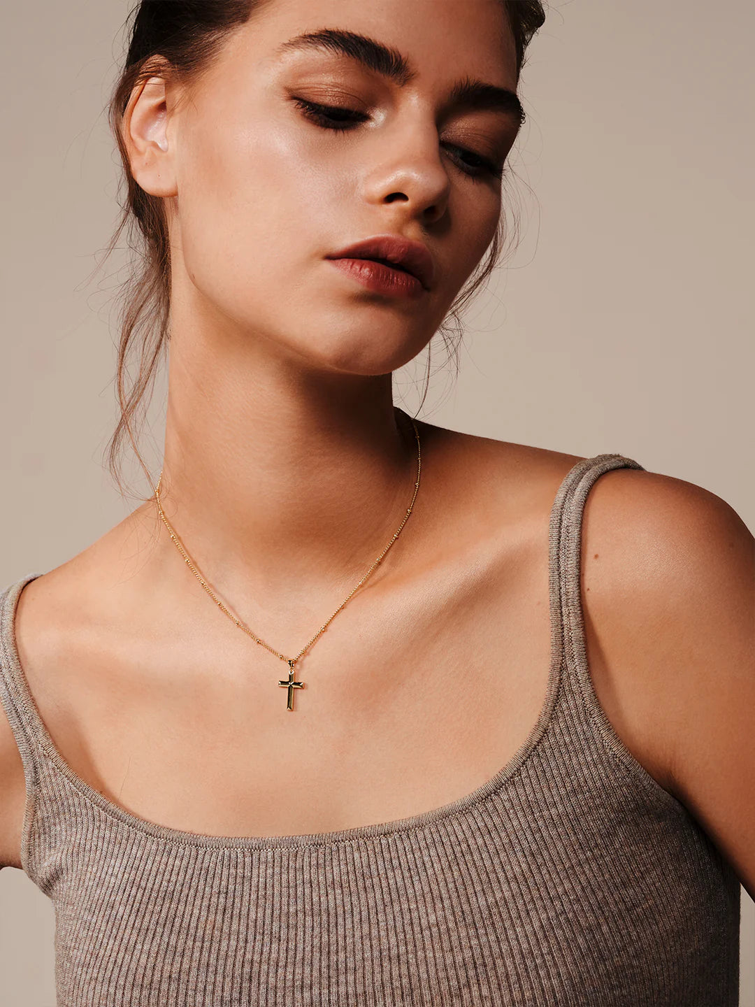 This minimalist gold cross pendant is a versatile piece that can be worn for any occasion and easily paired with other necklaces for different styles.