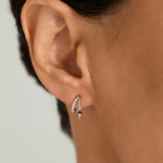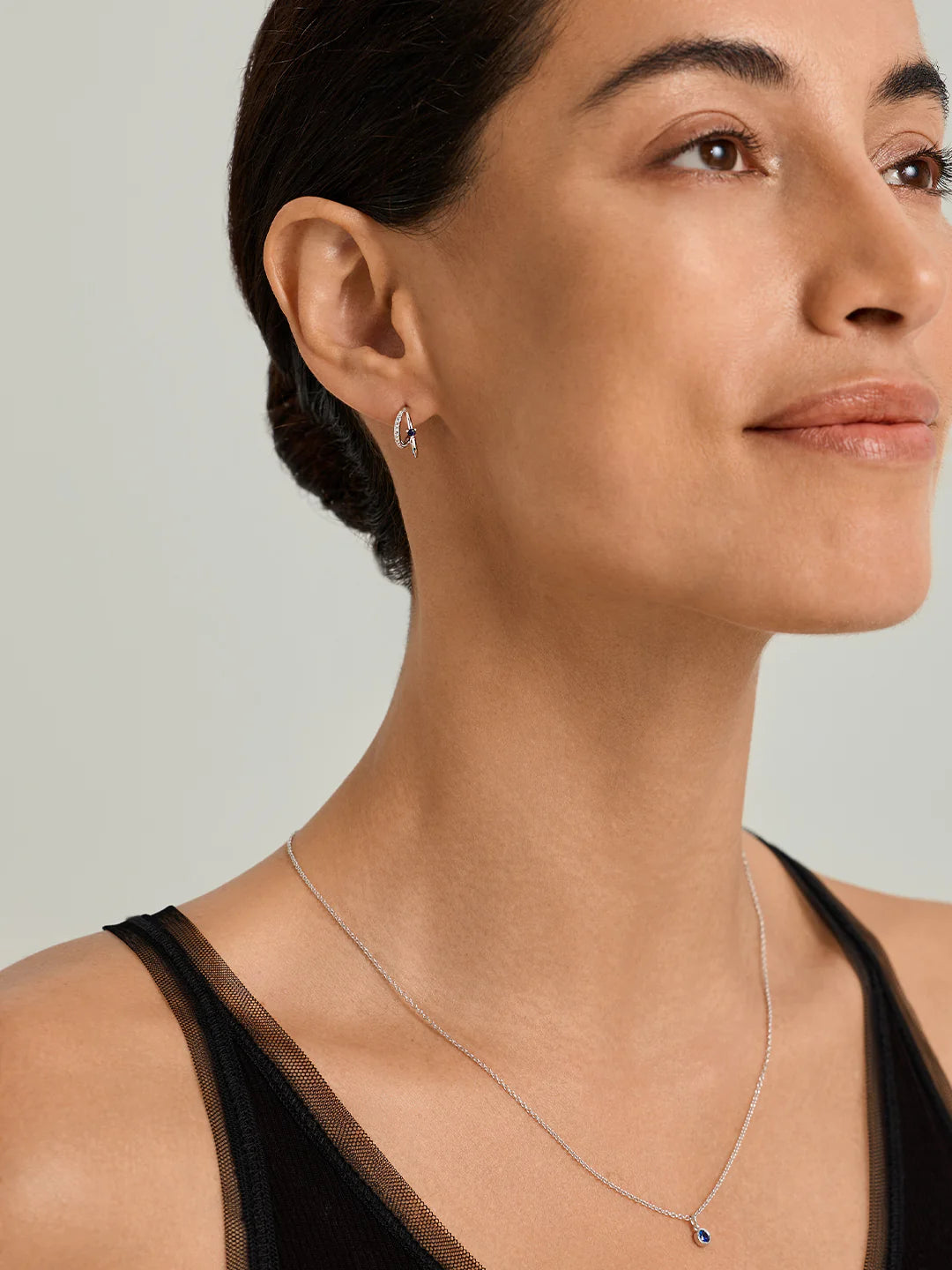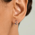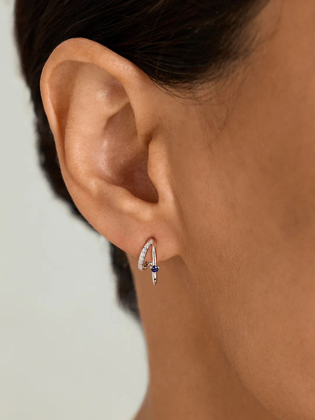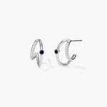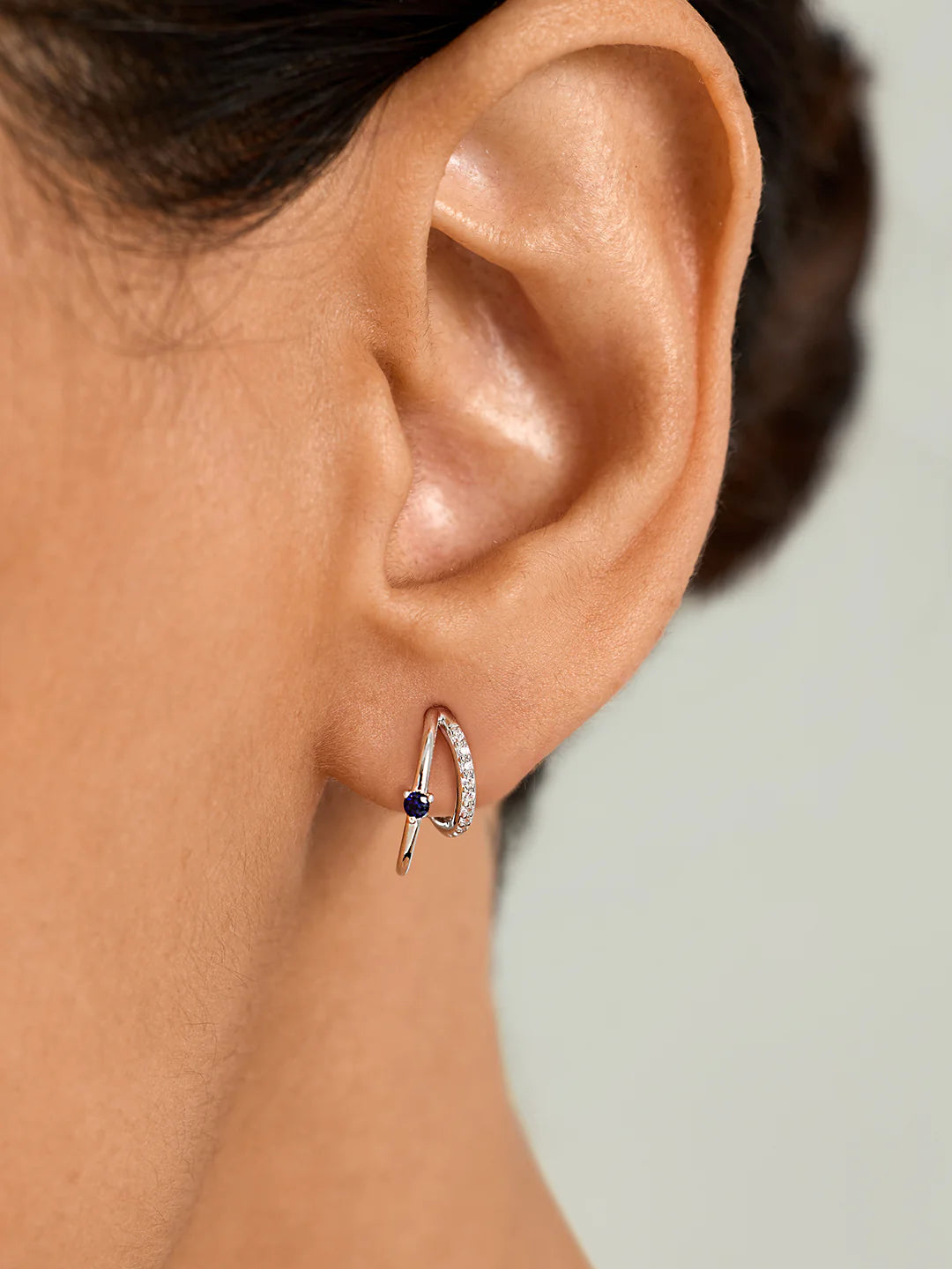 These delicate and shiny double-looped earrings are a must-have. They feature a larger hoop with a prong-set round blue sapphire at the front, and a smaller hoop with pave cz stones. The perfect balance of sparkle and elegance.