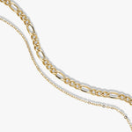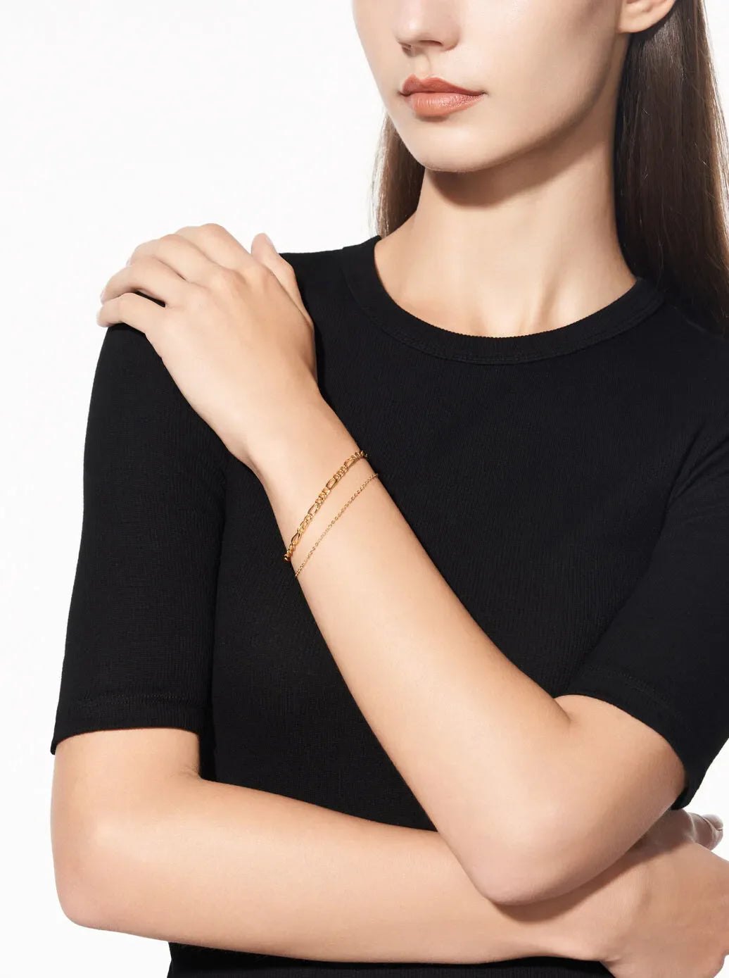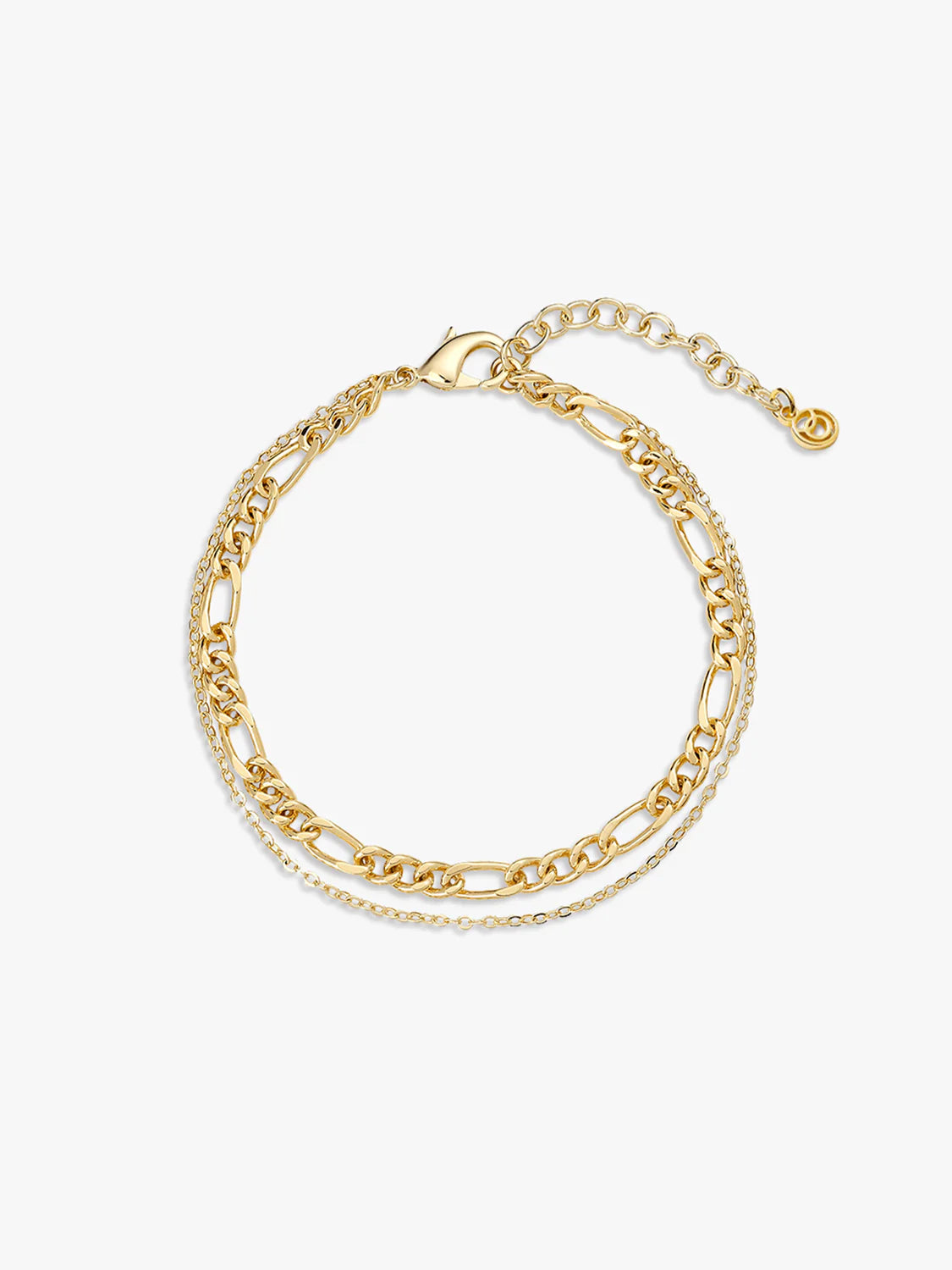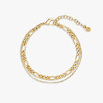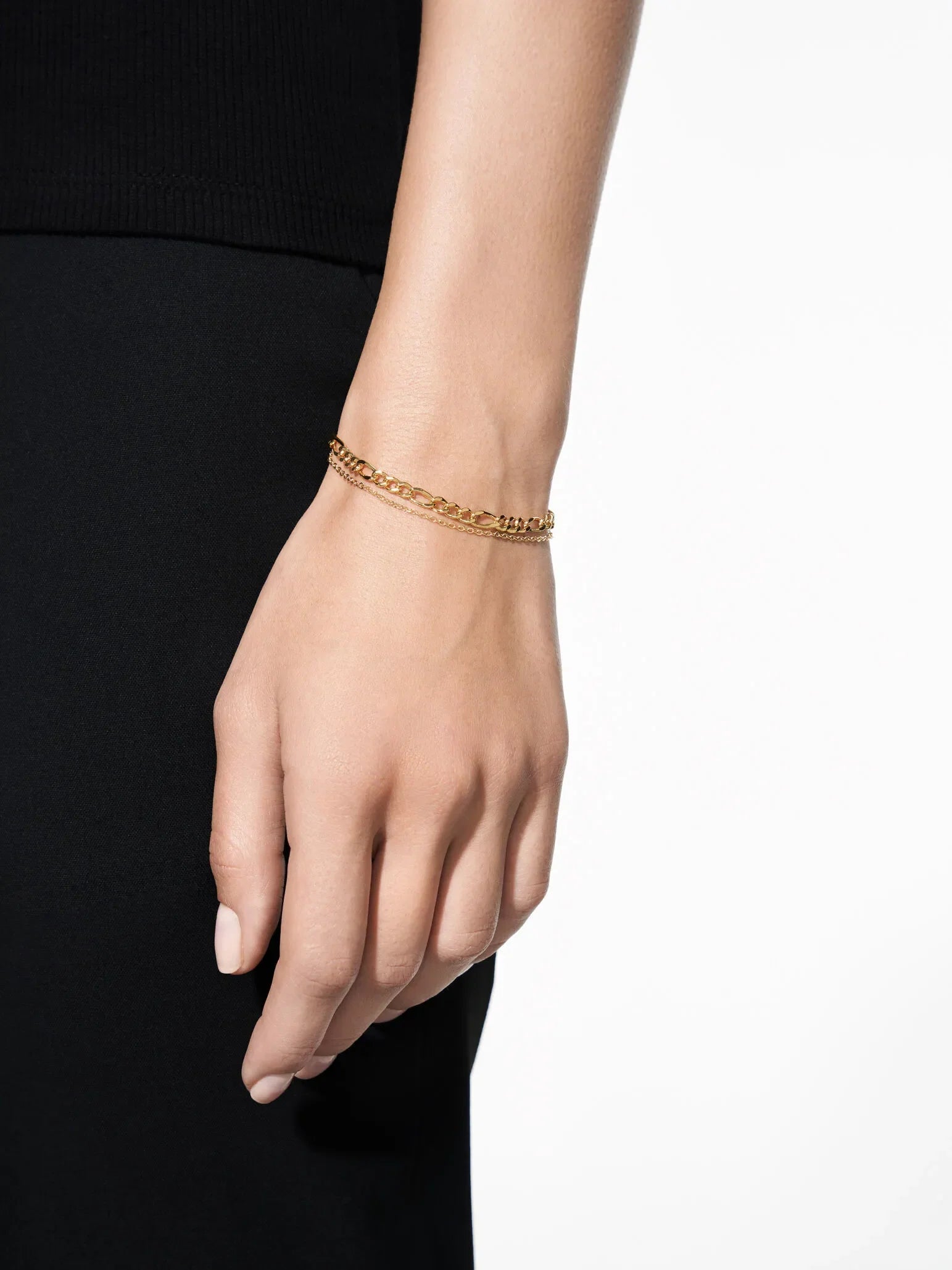 This classic Figaro layered bracelet is a true gem. Exquisitely plated with 18k gold, it adds a touch of elegance and refinement to any outfit. The intricate layering design gives it a timeless appeal that will never go out of style. Whether you're dressing up for a special occasion or just adding a touch of sophistication to your everyday look, this bracelet is the perfect accessory. With its delicate yet durable construction, it's sure to become a cherished piece in your jewelry collection for years to come.