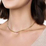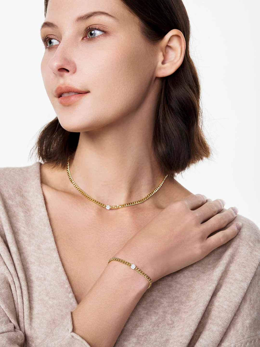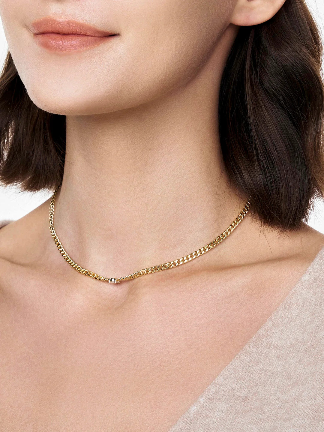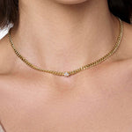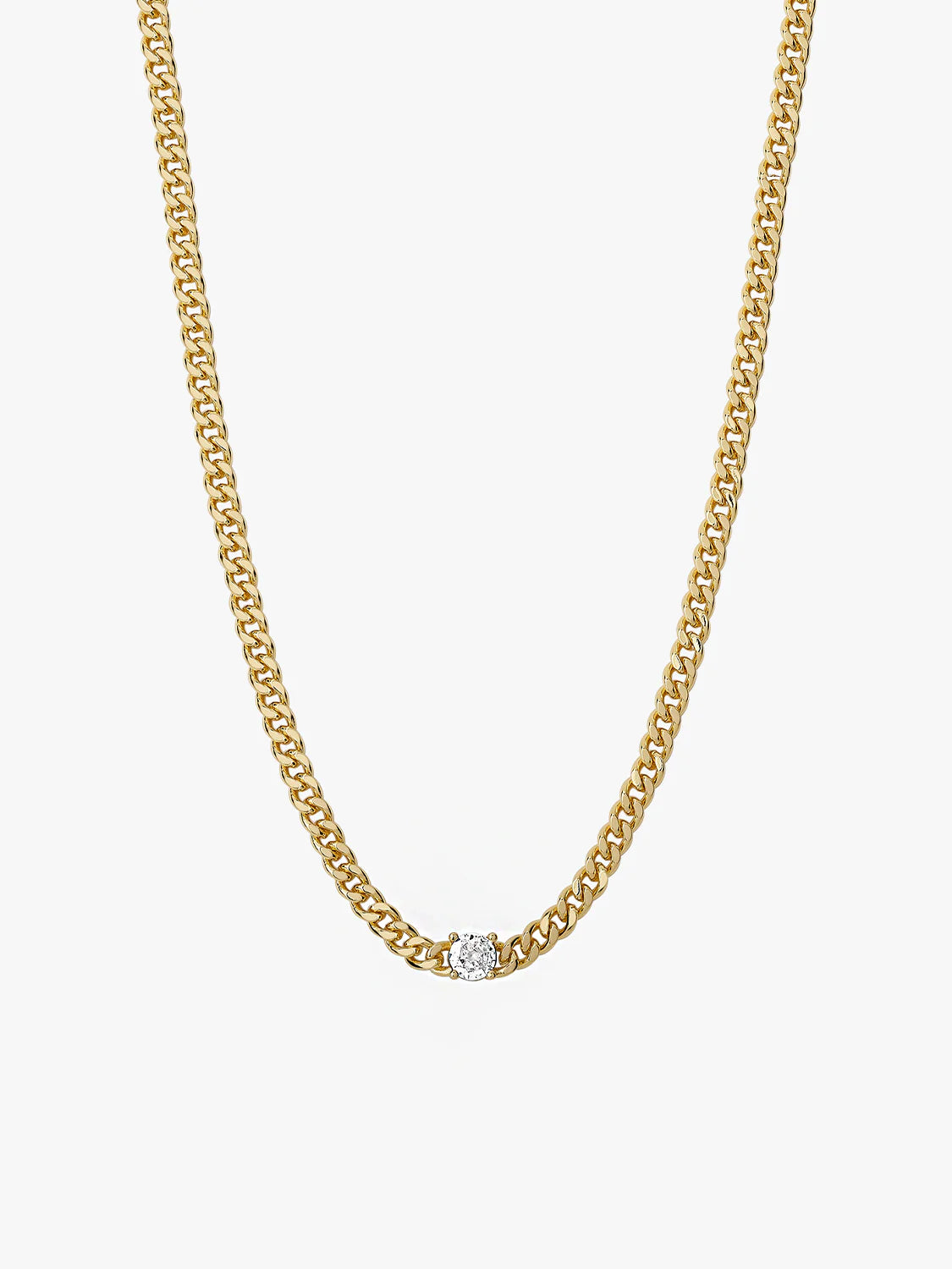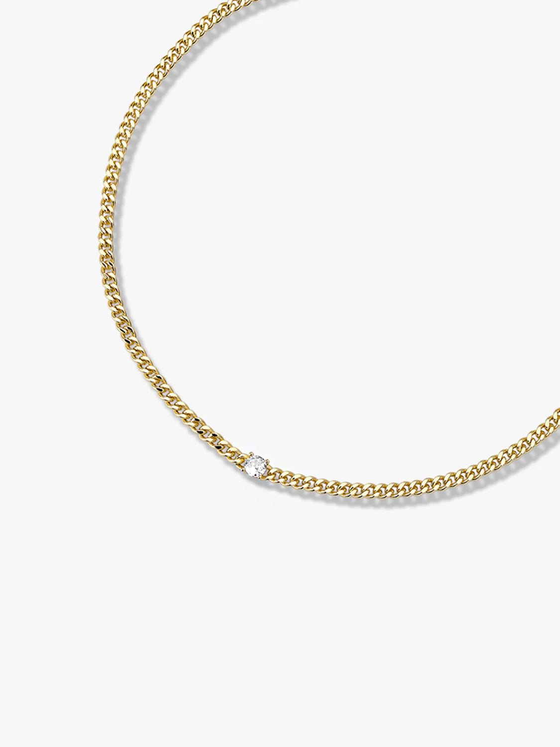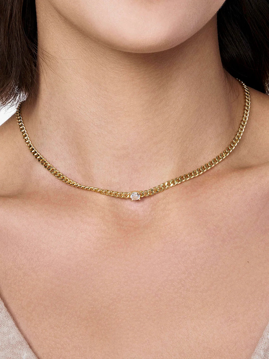 Elevate your everyday look with this bold necklace, adorned with a brilliantly-cut cubic zirconia. Its thick chain adds an extra touch of flair, ensuring you stand out in any crowd. This versatile piece is perfect for every occasion, from a day at the office to a morning workout session. Its shorter length allows for easy pairing with longer chains for a customizable layered look. A must-have essential for every jewelry collection, this necklace is sure to become your go-to accessory.