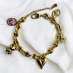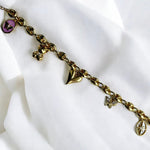 Introducing the handmade Esme Bracelet, a chic gold chain adorned with delightful charms. Featuring a cute teddy bear, a golden heart, and a lilac butterfly emblem, this piece combines playful charm with elegant sophistication, perfect for adding a touch of whimsical beauty to any outfit.