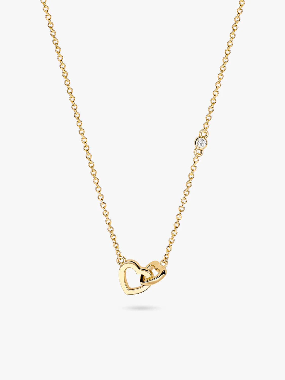 The design of our Interlocking Double Heart Pendant Necklace is inspired by the extension of our best-selling Double Heart collection. This more minimalist two-heart necklace is embellished with a delicate gem. It gives you a more simple and sophisticated option.