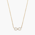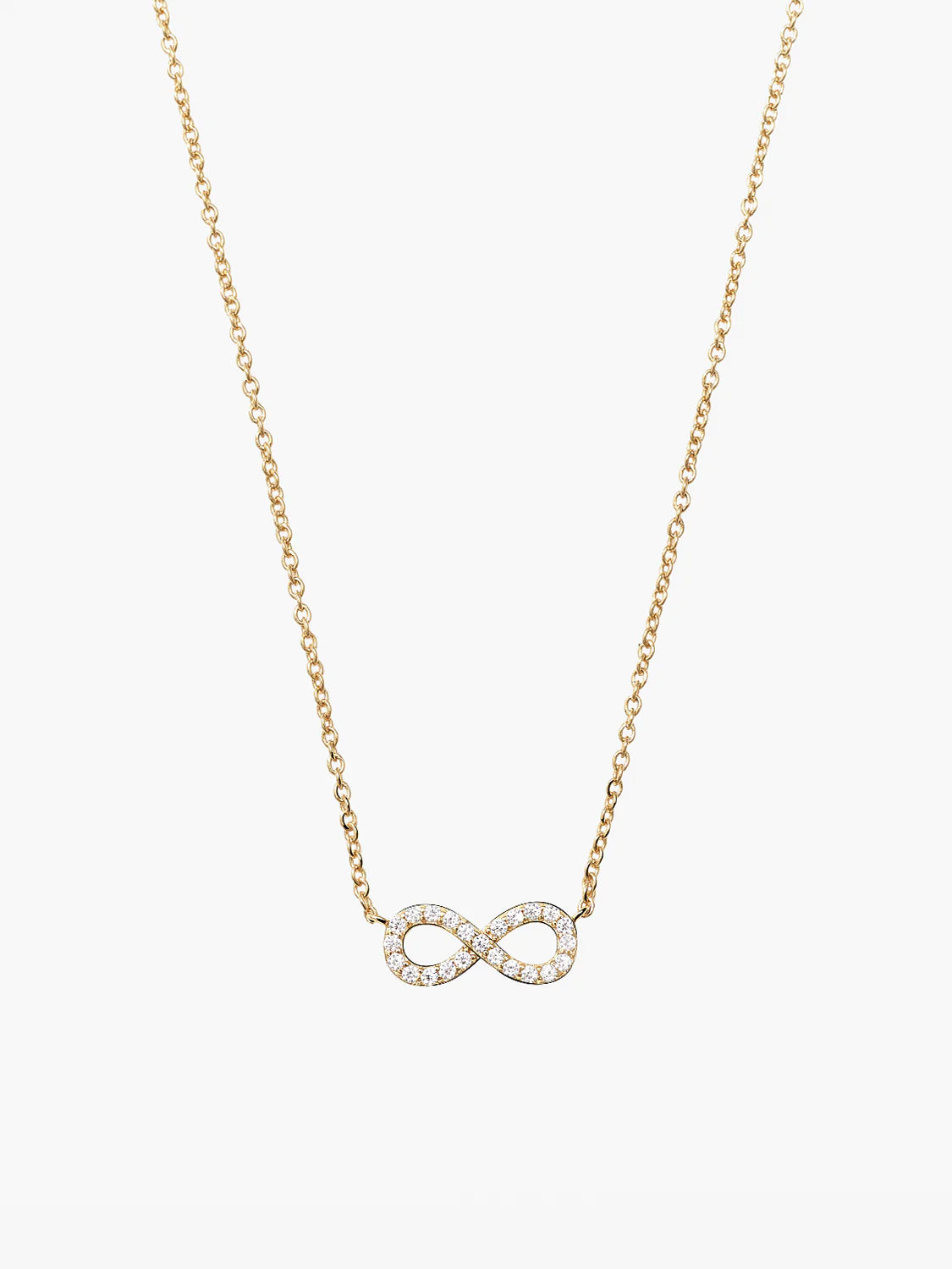 A delicate masterpiece that captures the romance of a gold infinity symbol adorned with 23 round micro cubic zirconias. Set at the heart of a dainty 18k gold vermeil adjustable length chain, this necklace becomes a radiant symbol of everlasting love.