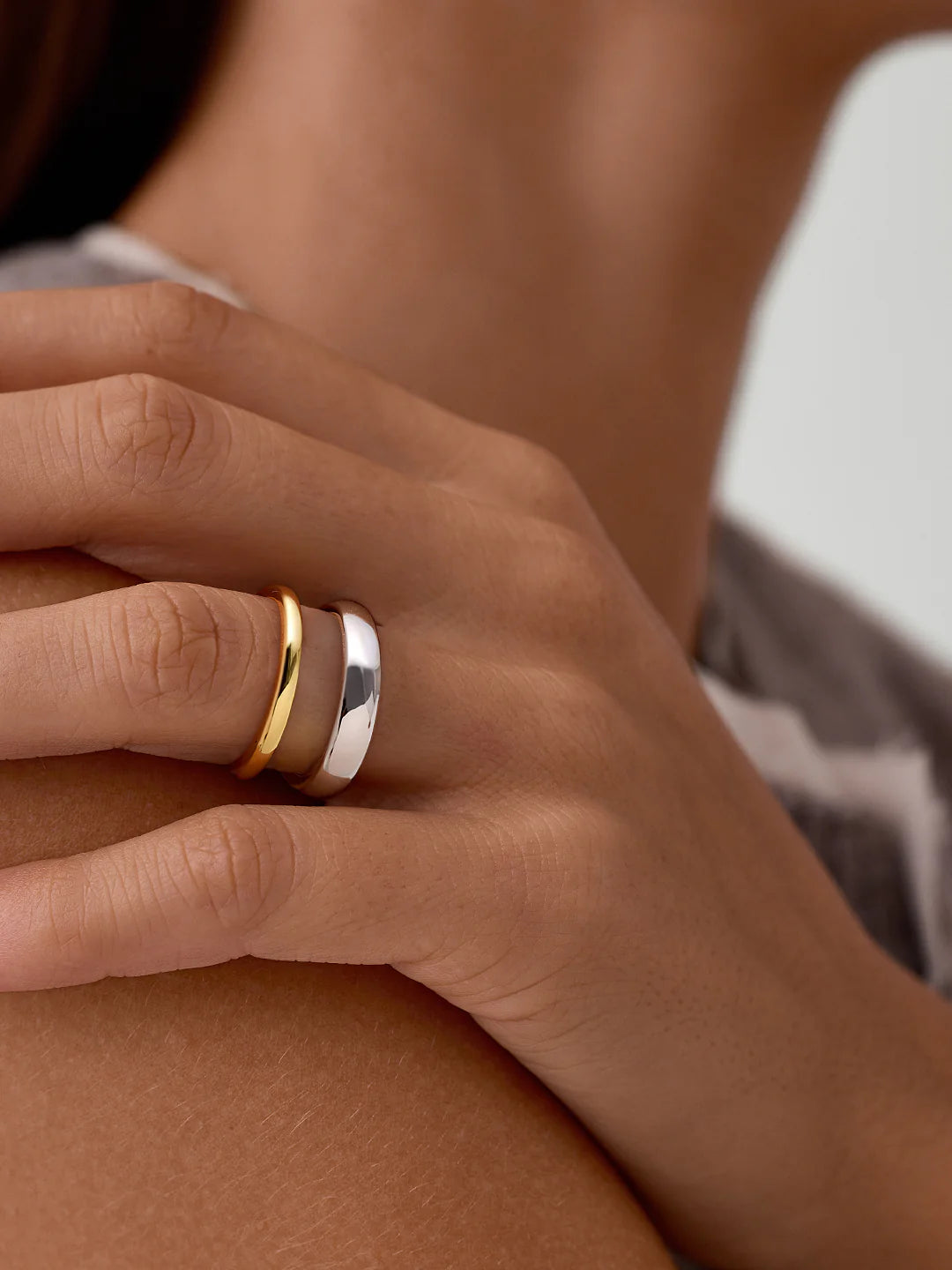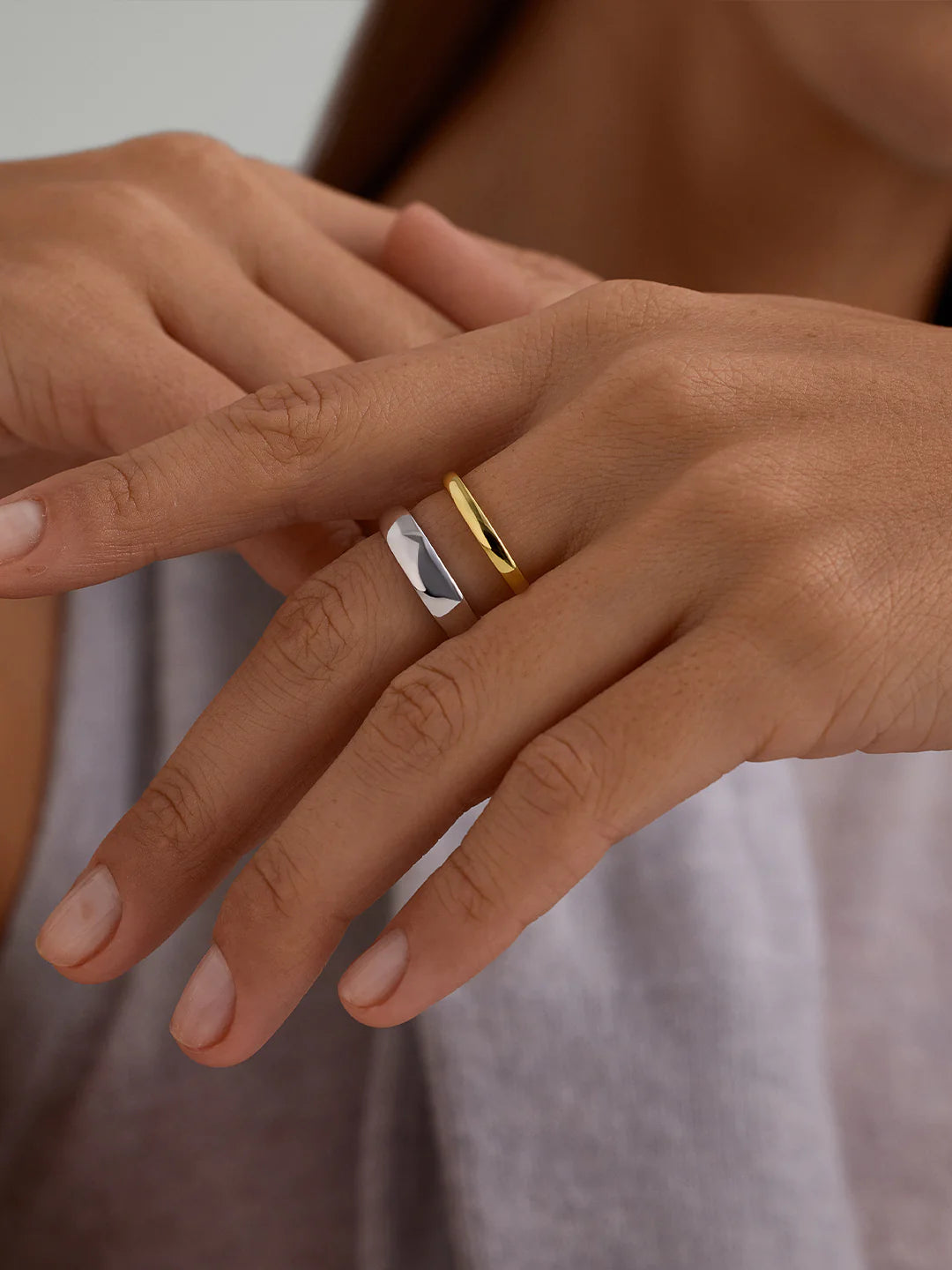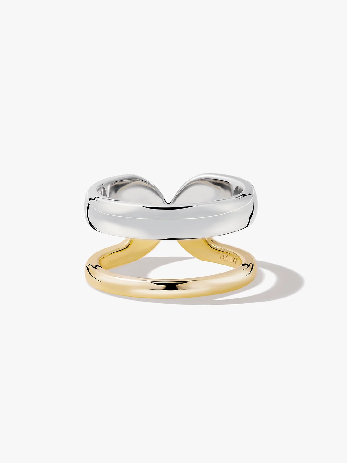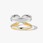 This ring features a striking dual-layer design that makes stacking effortlessly stylish. The mixed metals in varying widths create a beautiful interplay of textures, combining modern elegance with timeless versatility.