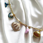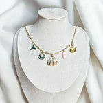 Dive into the serene beauty of the 'Ocean Whispers' necklace, a piece inspired by the treasures of the sea. This handcrafted necklace elegantly showcases a golden tail, a pearl-adorned scallop, intricate shells, and a soft pink spiral, all linked by a lustrous golden chain. It's perfect for anyone looking to carry a piece of the ocean's mystique with them.