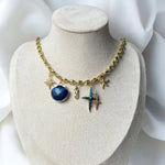 Dive into the depths of elegance with our handmade "Oceanic Star" necklace. This beautiful piece features a gold chain adorned with a selection of enchanting ocean-themed charms: a shimmering blue seashell, a sparkling starfish, a delicate seahorse, a radiant star, and a striking cross-shaped pendant with blue and green accents. Perfect for adding a touch of nautical charm to any outfit.