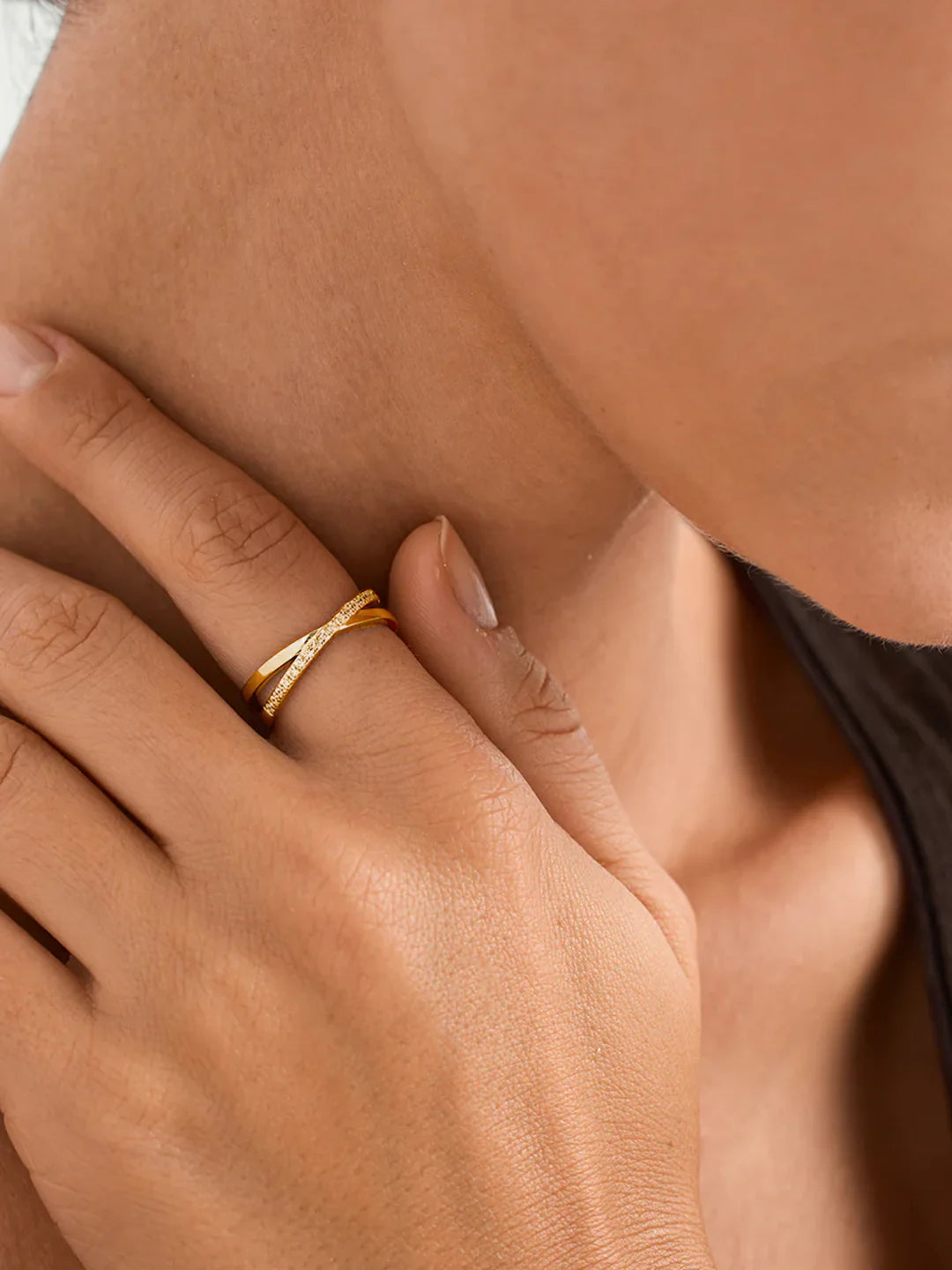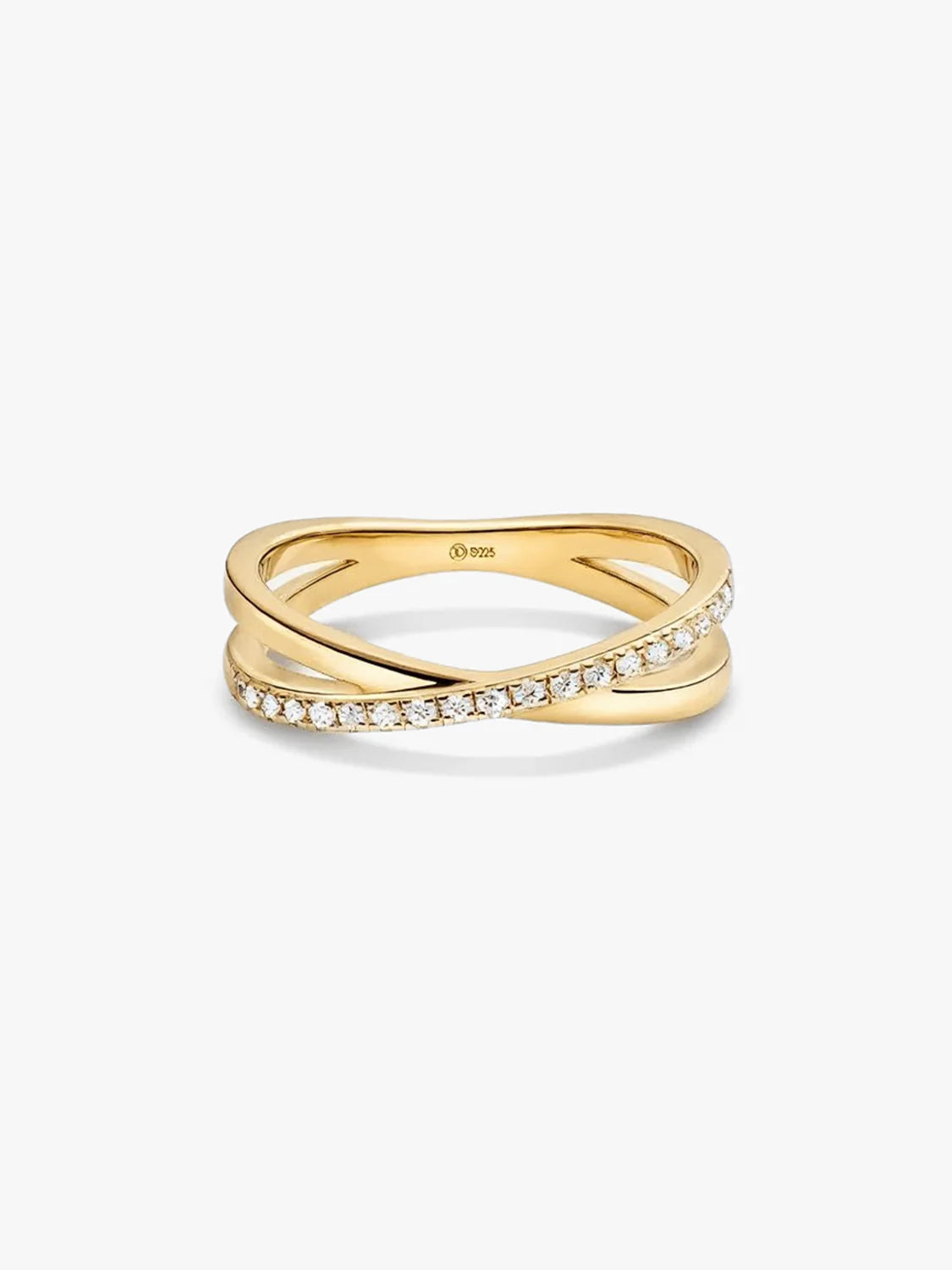 This exudes effortless elegance with its sleek crossover design and shimmering pave crystal accents. Crafted from polished silver, the intersecting bands create a graceful, layered effect that catches the light beautifully. A refined and timeless piece, perfect for adding a touch of sparkle to any look.