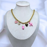 A playful gold-tone necklace featuring charming pink accents: a seahorse emblem, a ring, a mini milk bottle, a stitched heart, and a balloon dog. Perfect for adding a fun and quirky touch to your outfit!