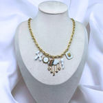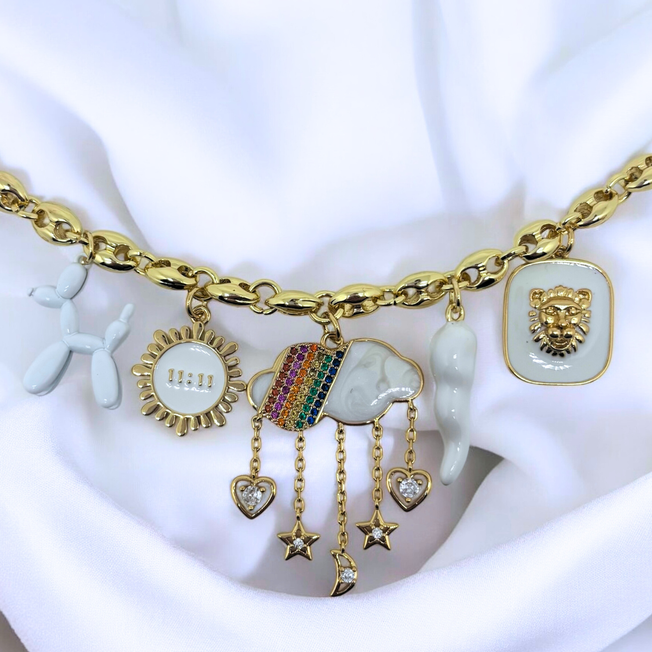 A whimsical gold charm necklace featuring playful and radiant designs, including a balloon dog, a vibrant rainbow cloud, and a regal lion. A unique accessory that blends charm, creativity, and elegance.