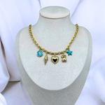 A playful gold-plated chain necklace adorned with charming seaside-inspired charms, including a seahorse medallion, sparkling ice cream cone, golden heart, teddy bear, and a turquoise starfish, evoking summer fun and nostalgic elegance.