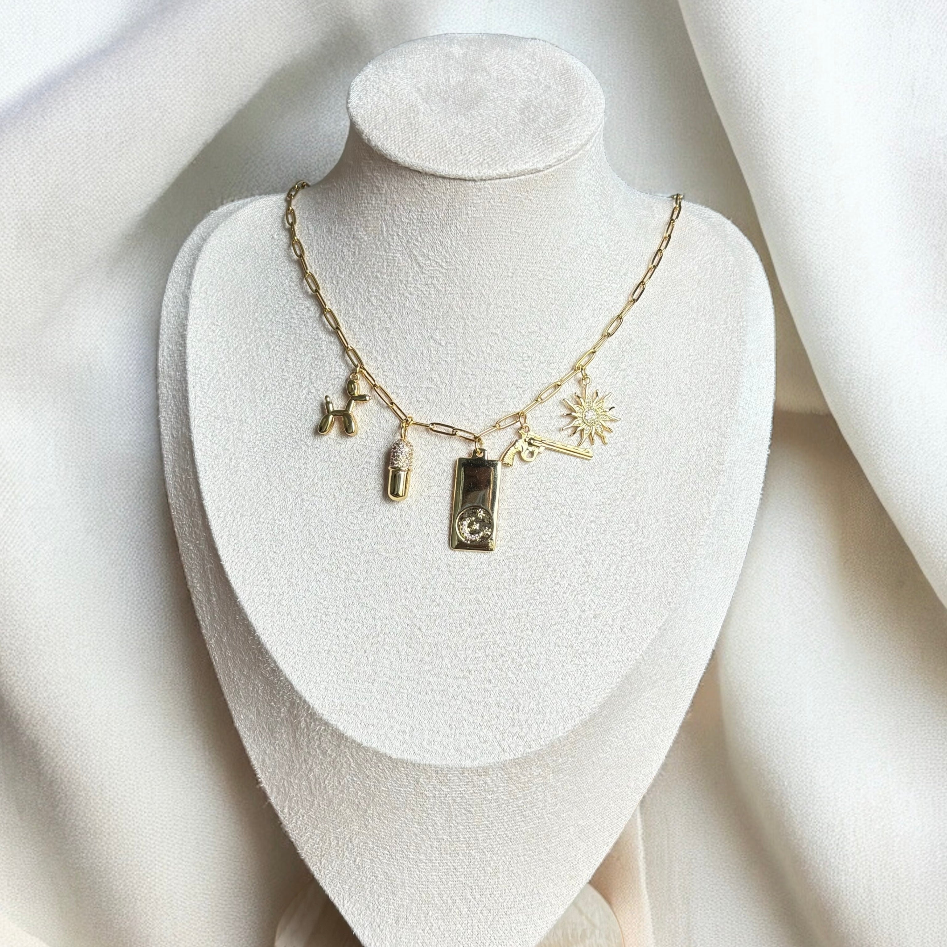 Stella Charm is a handcrafted gold necklace adorned with playful and unique charms, including a balloon dog, a sparkling pill, a vintage revolver, and a radiant sun, perfect for adding a bold and artistic flair to your look.